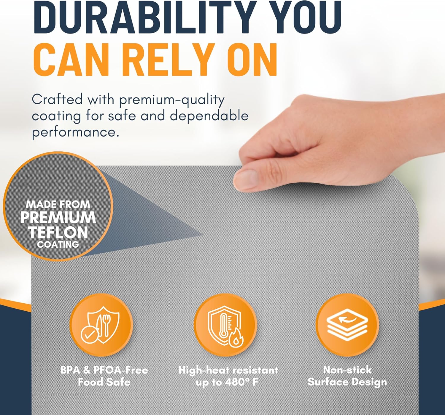 - PREMIUM QUALITY & SAFETY: Crafted from high-quality Teflon coating, our air fryer mat is BPA-free, PFOA-free, and heat resistant up to 480F. This ensures safe cooking without any harmful chemicals leaching into your food. Enjoy healthier meals with this durable, non-stick liner that stands up to high temperatures