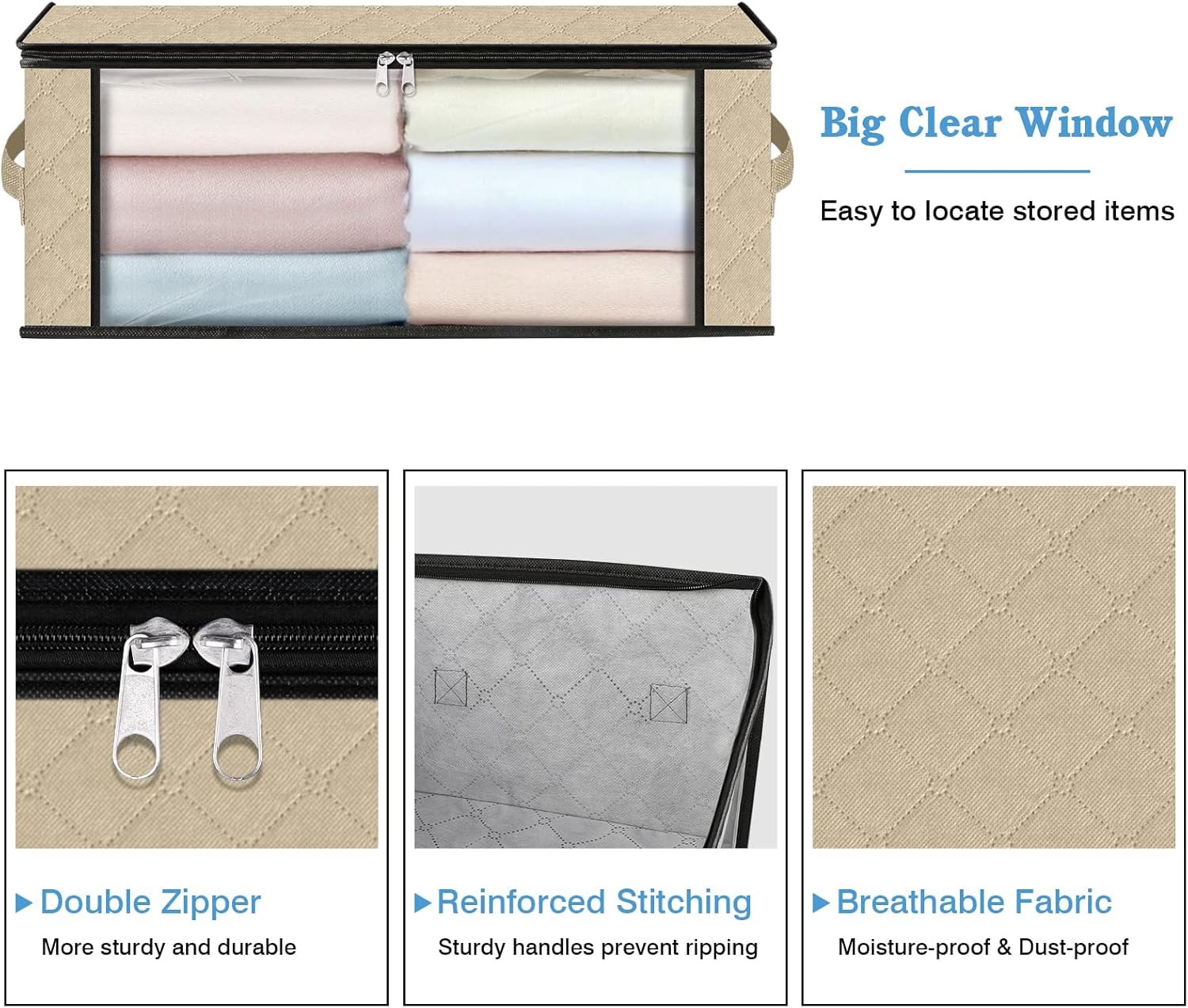 HomeHacks Storage 3-Pack Clothes Organizer Storage Bags Foldable Storage Box with Large Clear Window Sturdy Handles for Closet, Dorm, Pillows, Bedding, Clothes, Blankets, 35L, Beige
