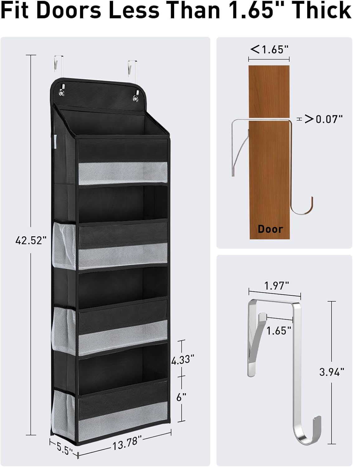 - 4 + 6 Large Capacity for Storage: The over door organizer hanging which is 42.52in x 13.78in x 5.5 in (H x L x W), boasts 6 mesh side pockets and 4-tier spacious storage bins. Each bin has a see-through mesh window for easy accessibility. The spacing between each tier, now increased to 4.33 inches, helps you accommodate different-sized items like wipes, toilet paper, snacks, and more daily necessities and baby items like newborn diapers. Meantime, side pockets are perfect to hold small items for tiny home