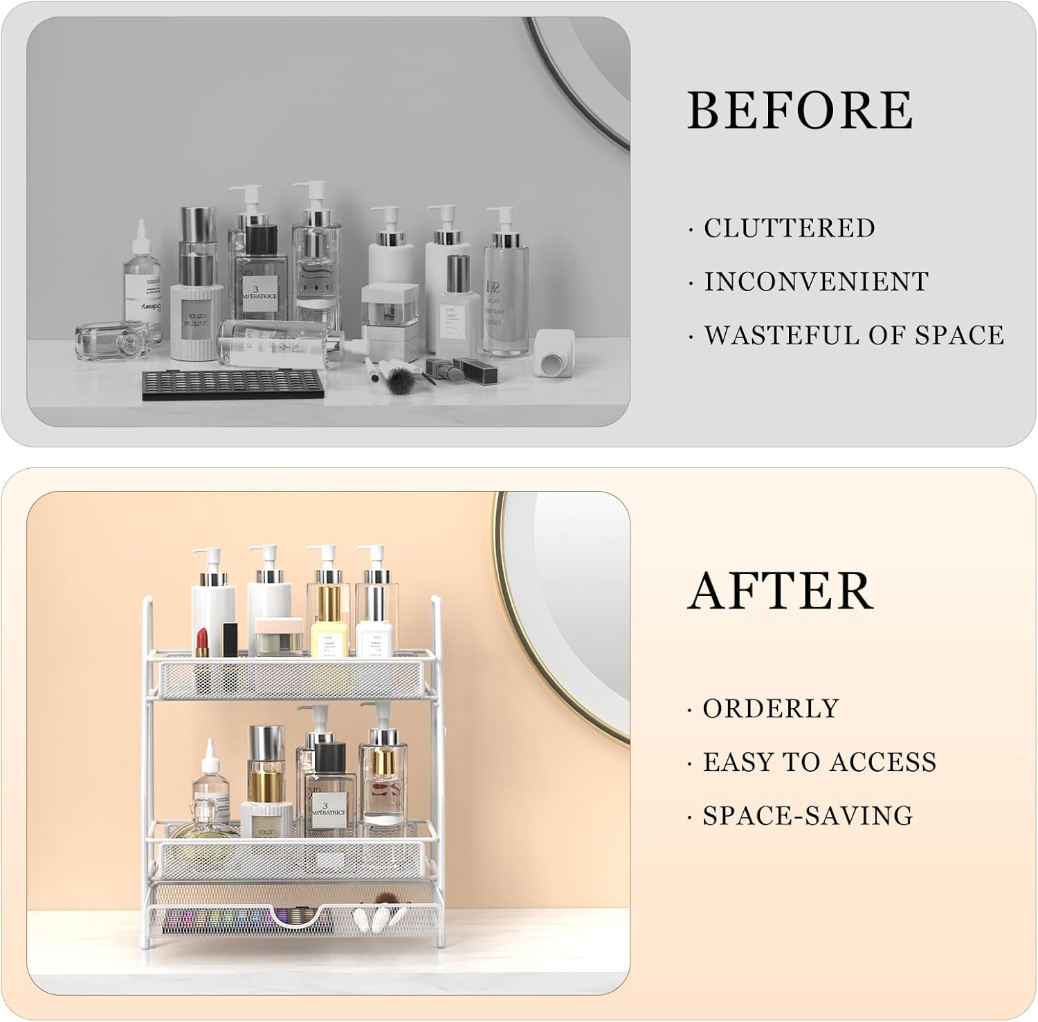 - 【2-Tier Bathroom Counter Organizer with Drawer】Our Makeup Organzier and bathroom organizer offers 2 layers of spacious storage for your Perfurm, llips, skincare and other bathroom accessories, our Makeup Organzier and Skincare organzier comes equipped with a drawer, offering an additional storage option for smaller items .The top bathroom vanity tray can be protected all around to prevent bottles from falling.