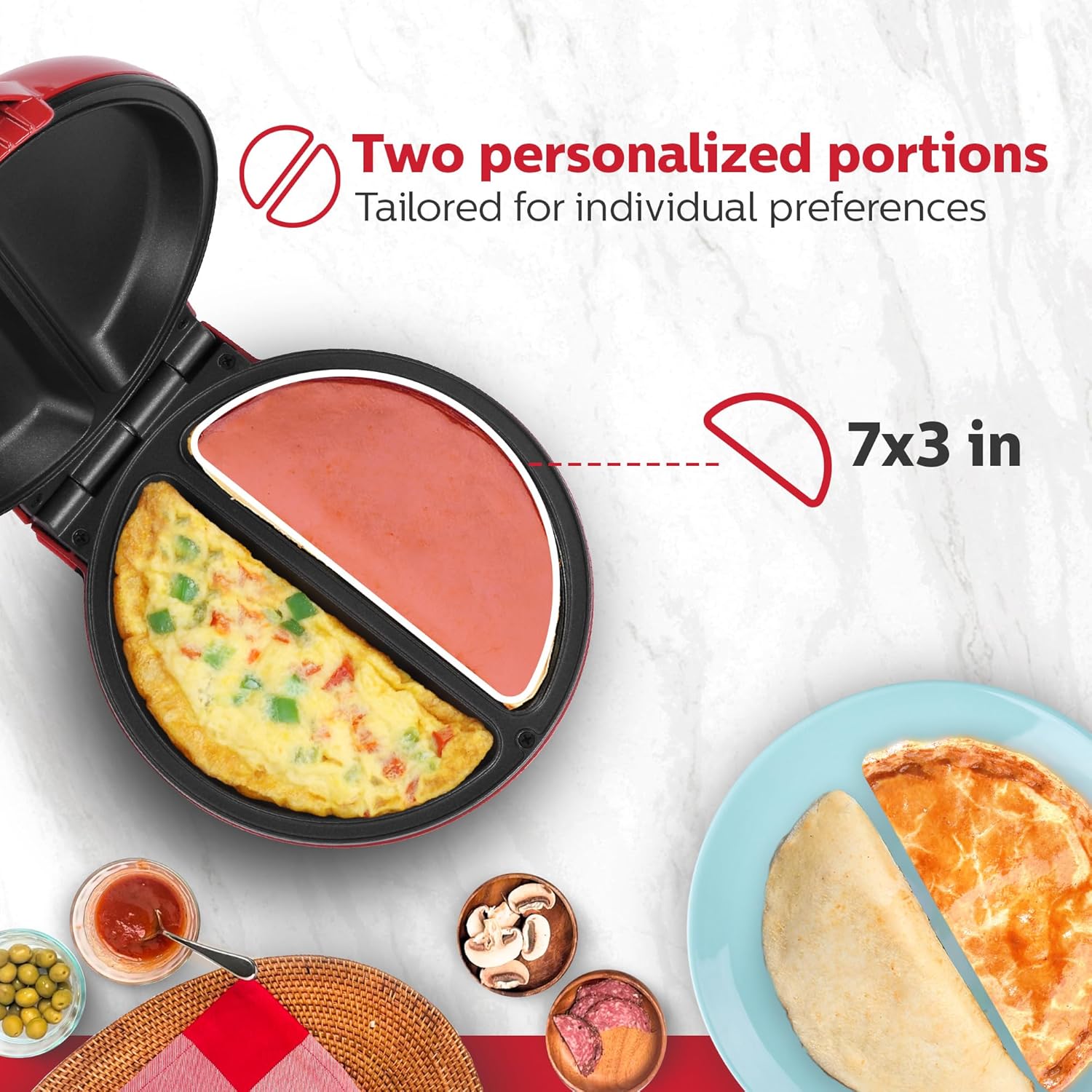 - MANY DELICIOUS CHOICES - Makes two fluffy omelets in just minutes. And this handy maker isn’t just for omelets: you can make frittatas, pizza pockets, apple turnovers and so much more! You can make two customized individual portions at a time to satisfy everyone’s breakfast, lunch, or dinner requests