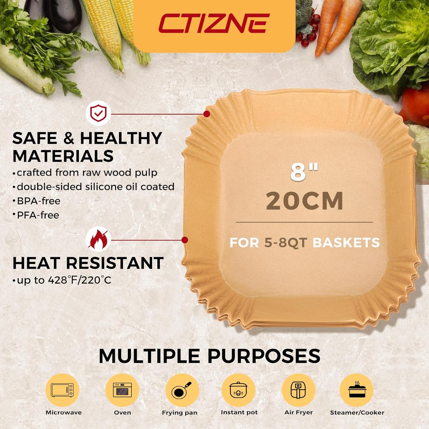 • Healthy Food Grade Material: Airfryer liners are made of 100% food-grade parchment and silicone oil coating. They are unbleached, BPA-free, PFAs-free, waterproof, oil-proof and non-stick. It can withstand temperatures up to 428°F.