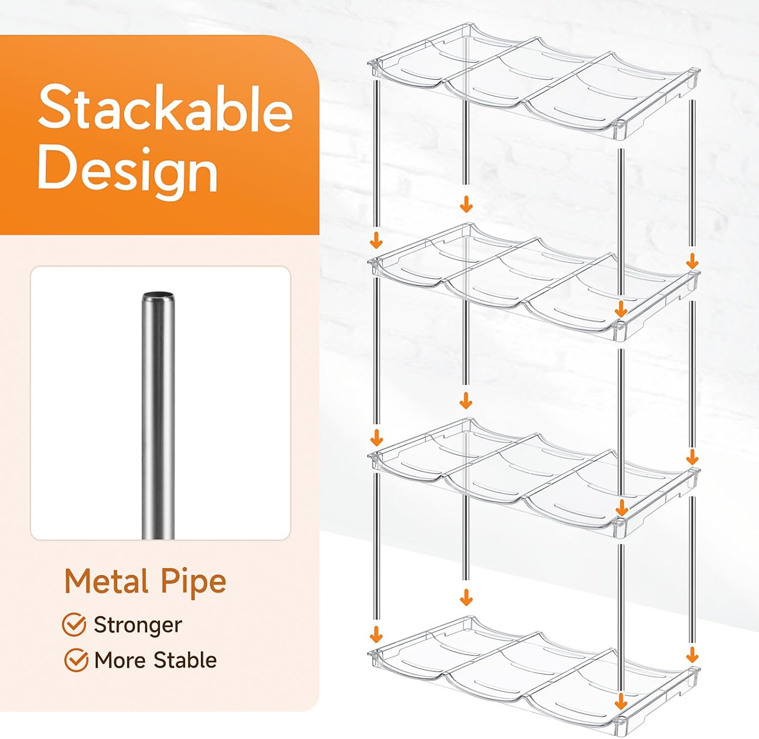 - 【STACKABLE & SPACING SAVING】This water bottle organizer can hold up to 3 bottles on each shelf. It features a stackable design, the 4-layer of cup holders can be tightly stacked together, maximizing space saving. The bottle storage rack makes water bottles easy to store and keeps your kitchen or cabinet space clean and tidy. 4 pack water bottle organizer perfect storage size: 11.90" x 7.16" x 13.15".