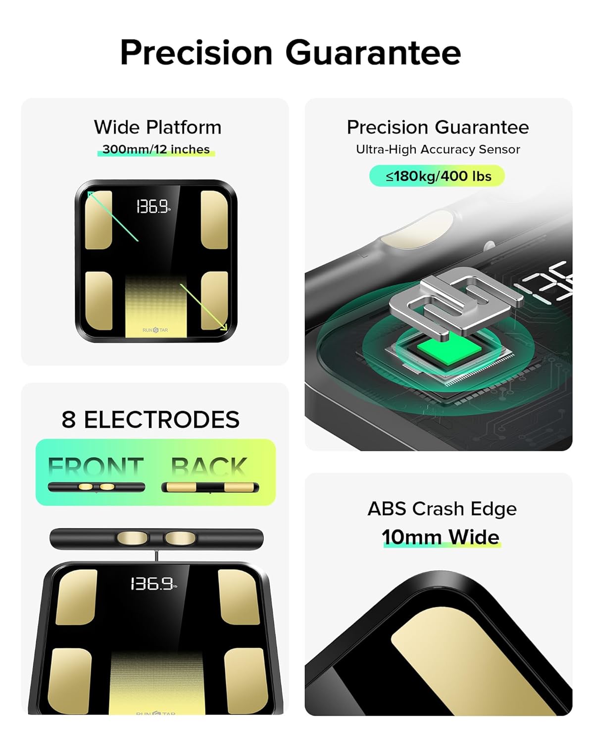 - Full-Body Scan at Home: The RunStar smart body fat scale uses 8 metal electrodes and dual-frequency BIA system to precisely capture upper and lower body impedance for more complete insights. Track 28 body composition metrics—including Body Fat, BMI, Visceral Fat and Muscle Mass—with 0.1 lb increments and up to 400 lb capacity.