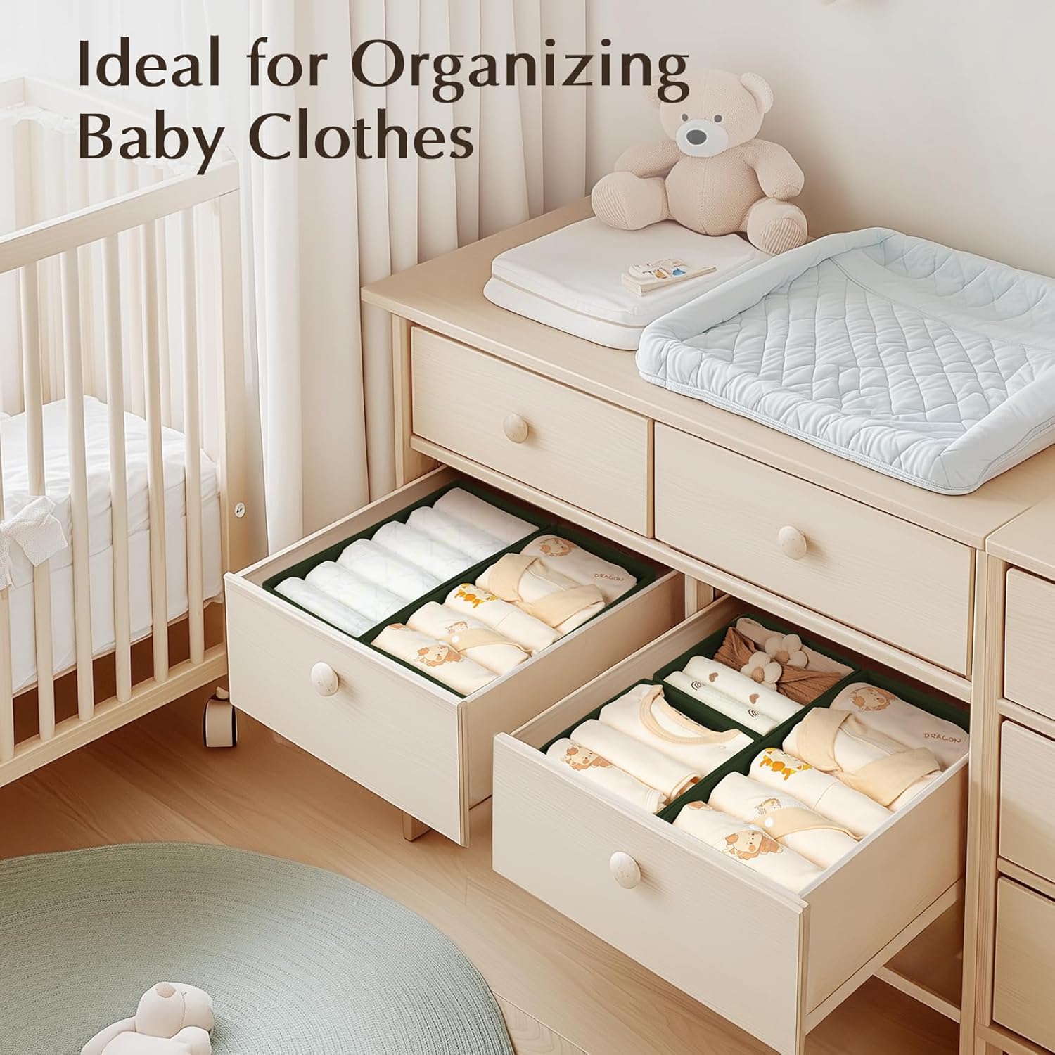 DIMJ Drawer Organizers Clothes, Set of 8 Dresser Organizer Bins, Fabric Closet Organizers and Storage, Shallow Drawer Dividers for Nursery, Clothing, Baby Clothes, Socks, Underwears, Tie (Green)