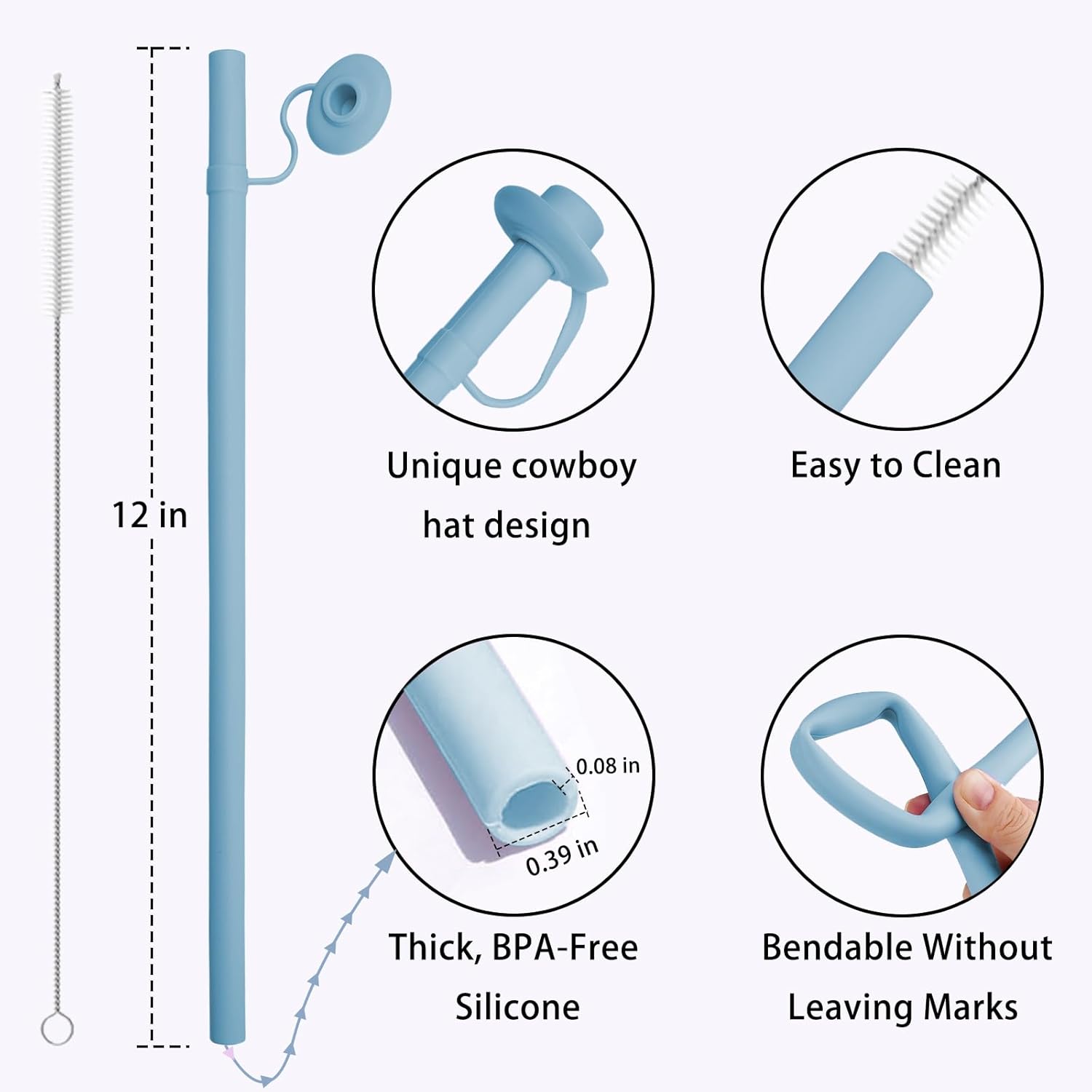2PCS Reusable Silicone Straws with Cover, Bite-Safe, 12”Long Collapsible Drinking Straws for Stanley Owala Cups, Tumblers & Travel – Trim to Fit Any Cup (Blue)