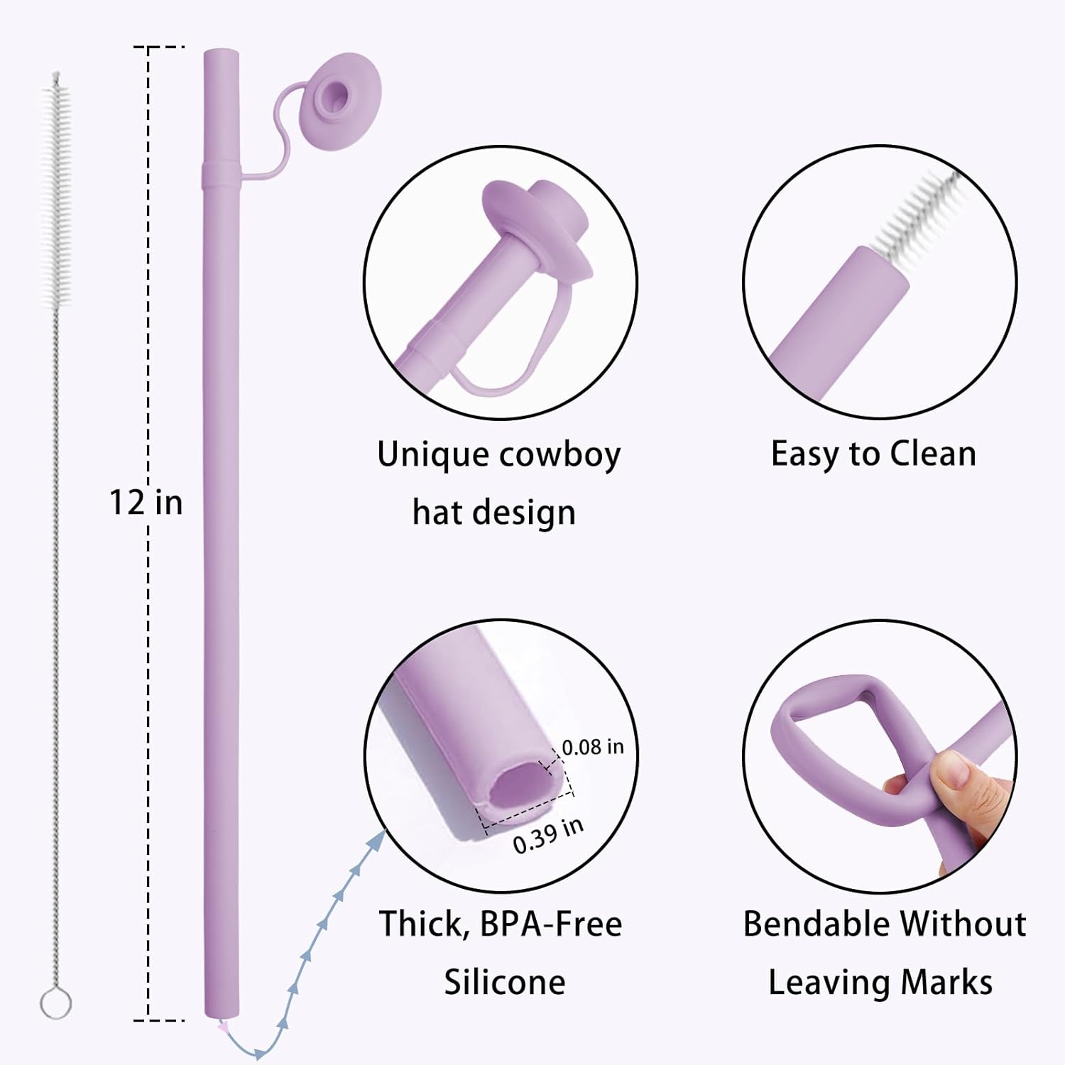 4PCS Reusable Silicone Straws with Cover, Bite-Safe, 12”Long Collapsible Drinking Straws for Stanley Owala Cups, Tumblers & Travel – Trim to Fit Any Cup (Purple,Blue,Pink,Grey)