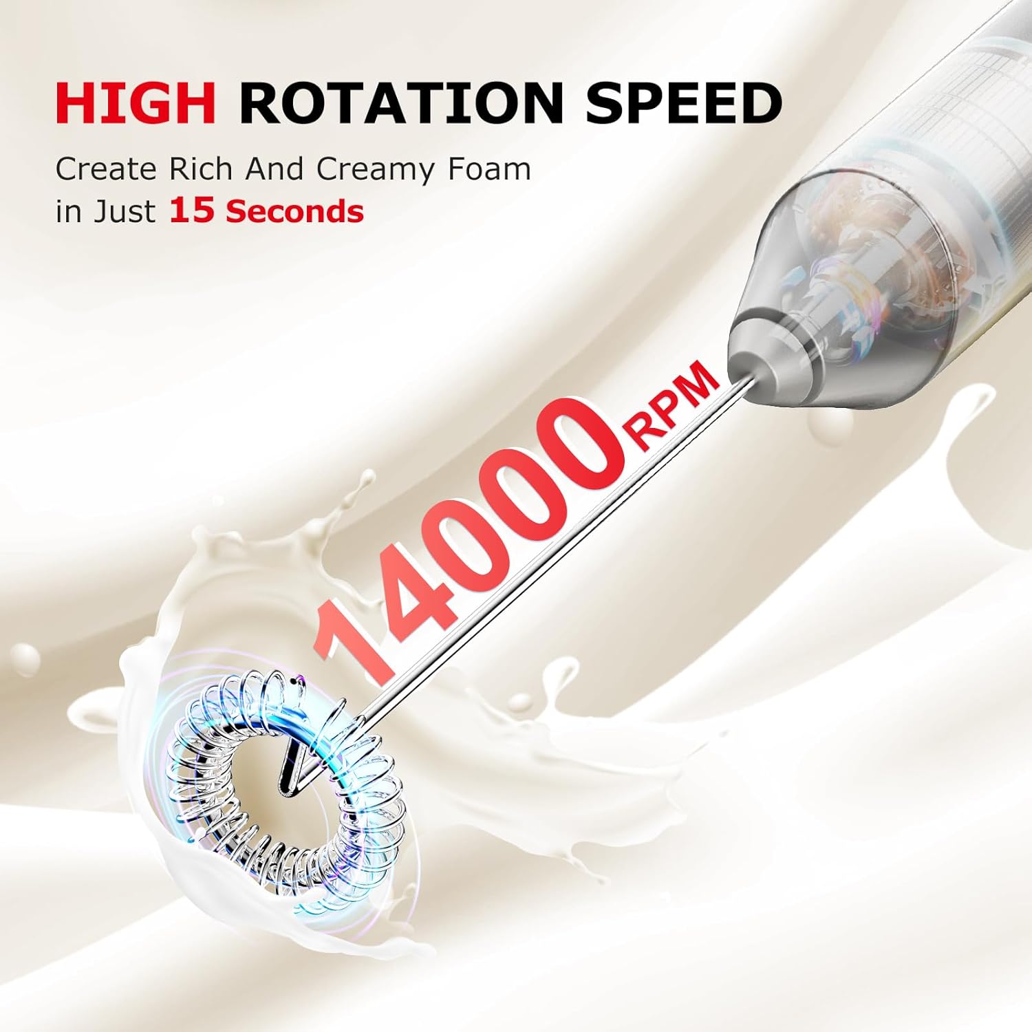 - MAKE CREAMY FROTH IN SECONDS: The powerful handheld milk frother with high-speed rotation of food safe stainless-steel whisk allows you to easily create a rich, creamy froth in just 15-20 seconds. The built-in powerful low-noise (<60dB) motor ensuring an efficient start to your day without disturbing your family's sleep.