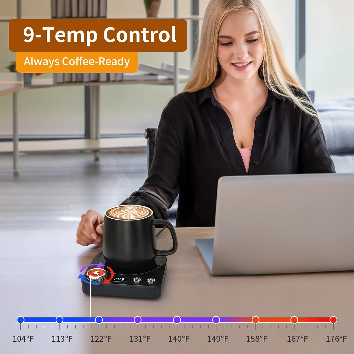 - 9-Temp Coffee Warmer Control: Knob-adjust from 104°F-176°F (40°C-80°C). Customize heat for any cup – gentle warmth or toasty perfection. Your coffee warmer, your rules.