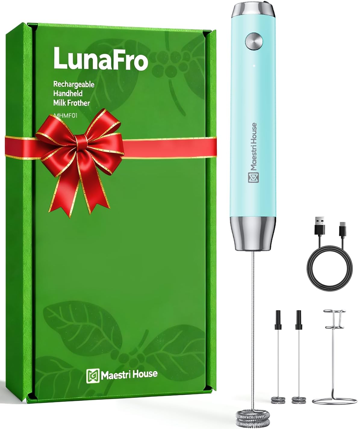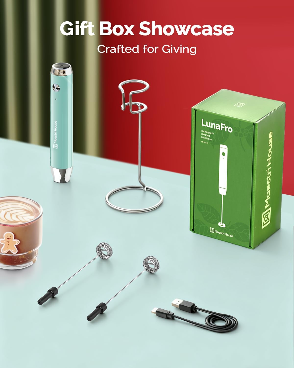 Maestri House Rechargeable Milk Frother with Stand, Handheld Electric Foam Maker Waterproof Detachable Stainless Steel Whisk Drink Mixer Foamer for Lattes, Cappuccino (Soft Aqua(Gift Box))