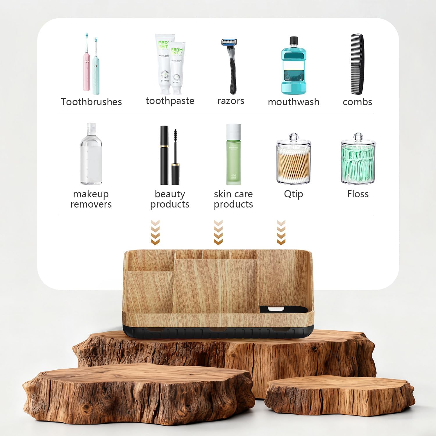- SUPERIOR ORGANIZER: The bathroom countertop organizer sets is designed with 2 tiers and 7 slots. The tiered divider design can separately organize bathroom accessories such as electric toothbrush, toothpaste, cosmetics, mouthwash, razor and floss