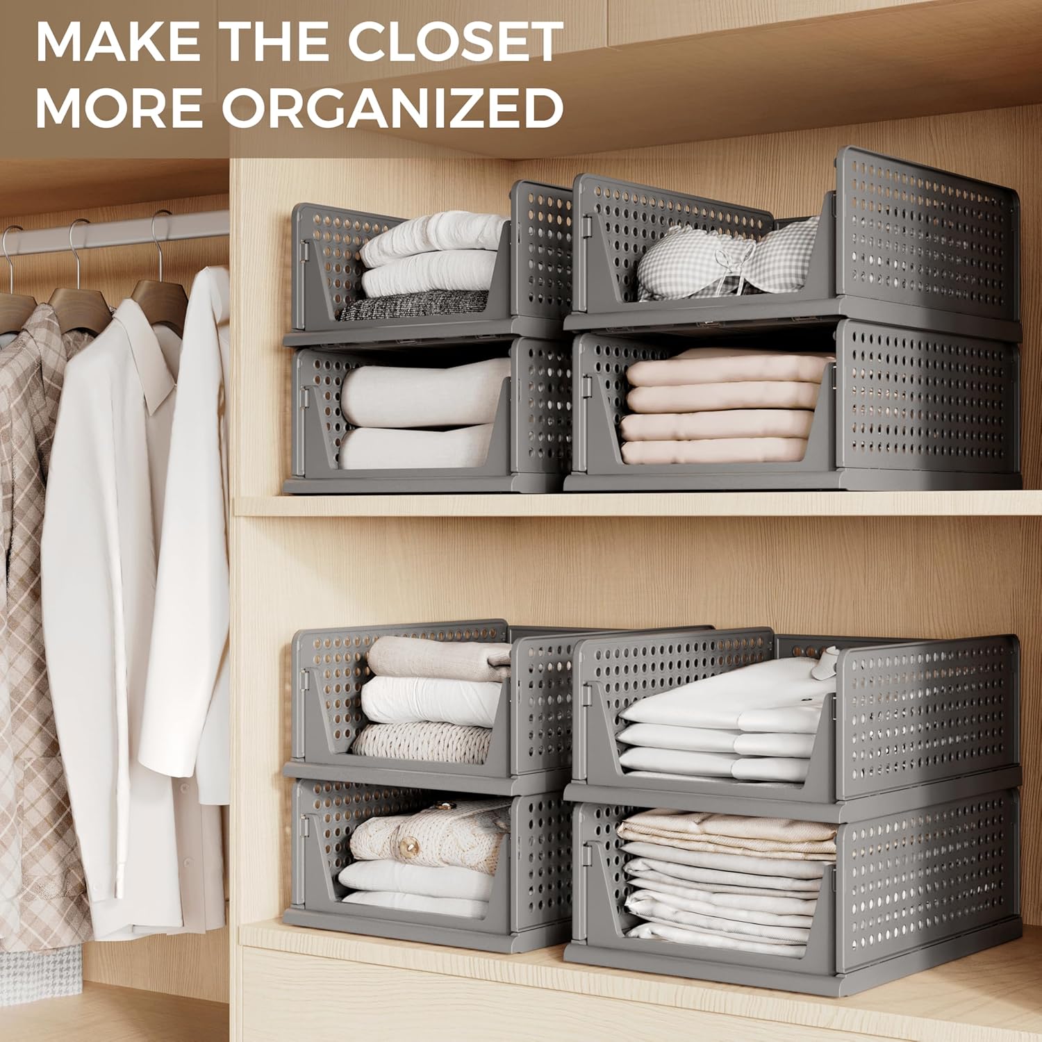 Pinkpum 8 Pack Closet Organizers and Storage Plastic Stackable Storage Bins, Foldable Drawer Shelf Storage Container for Wardrobe Kitchen Bathroom Dorm Black