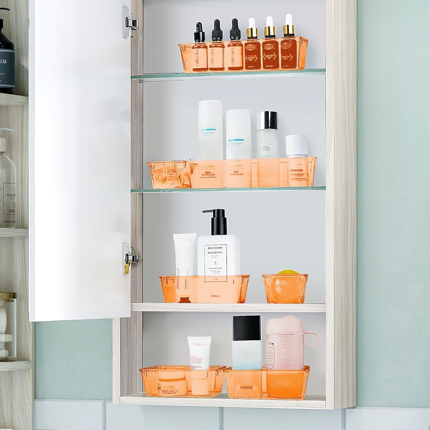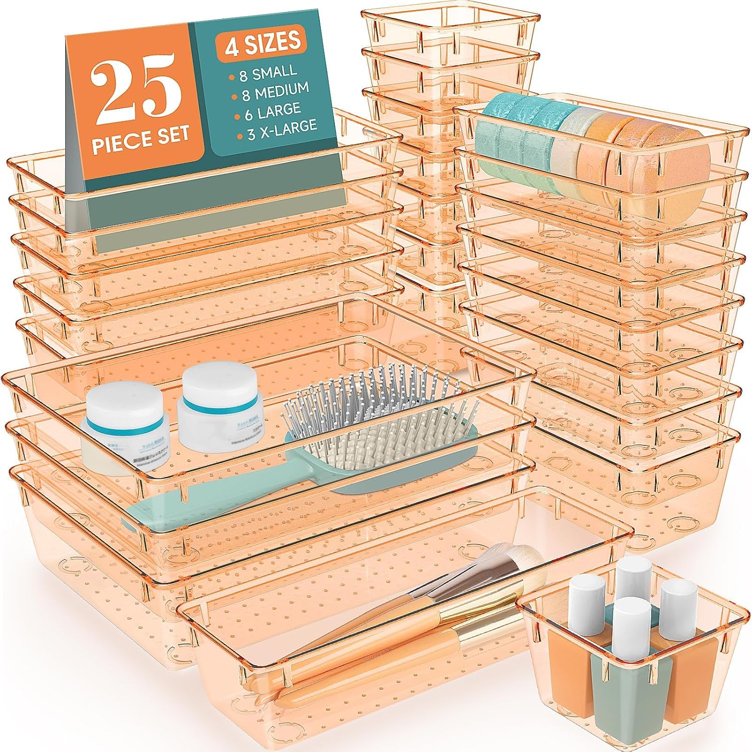 WOWBOX 25 PCS Plastic Drawer Organizer Set, 4 Sizes Desk Drawer Divider Organizers and Storage Bins for Makeup, Jewelry, Gadgets for Kitchen, Bedroom, Bathroom, Office, Clear Orange