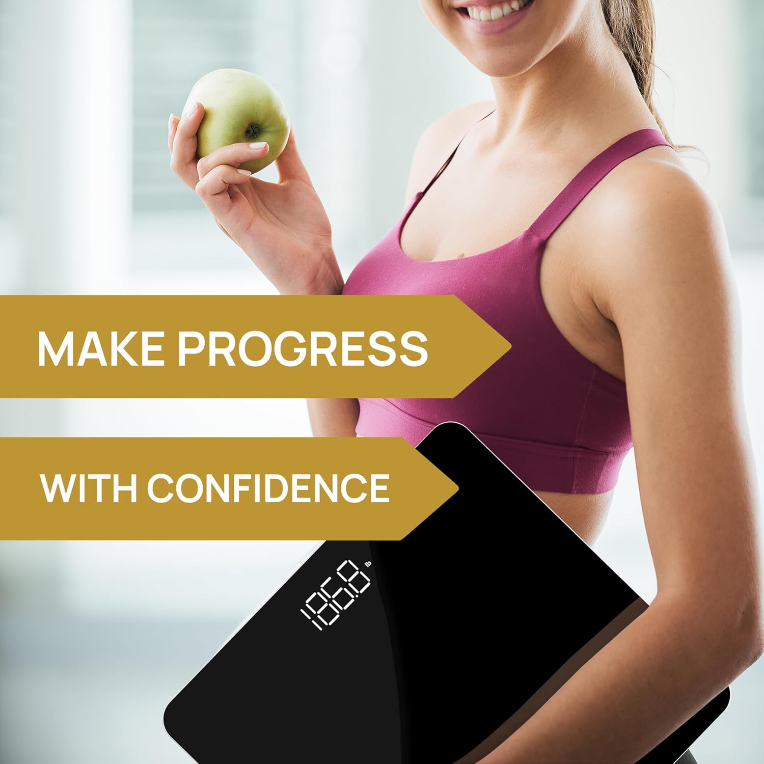 - MEET YOUR FITNESS GOALS FASTER: Accurately monitor your body weight by stepping on the large 11.8” x 11.8” premium tempered glass platform to track your progress and reach your fitness goals faster.